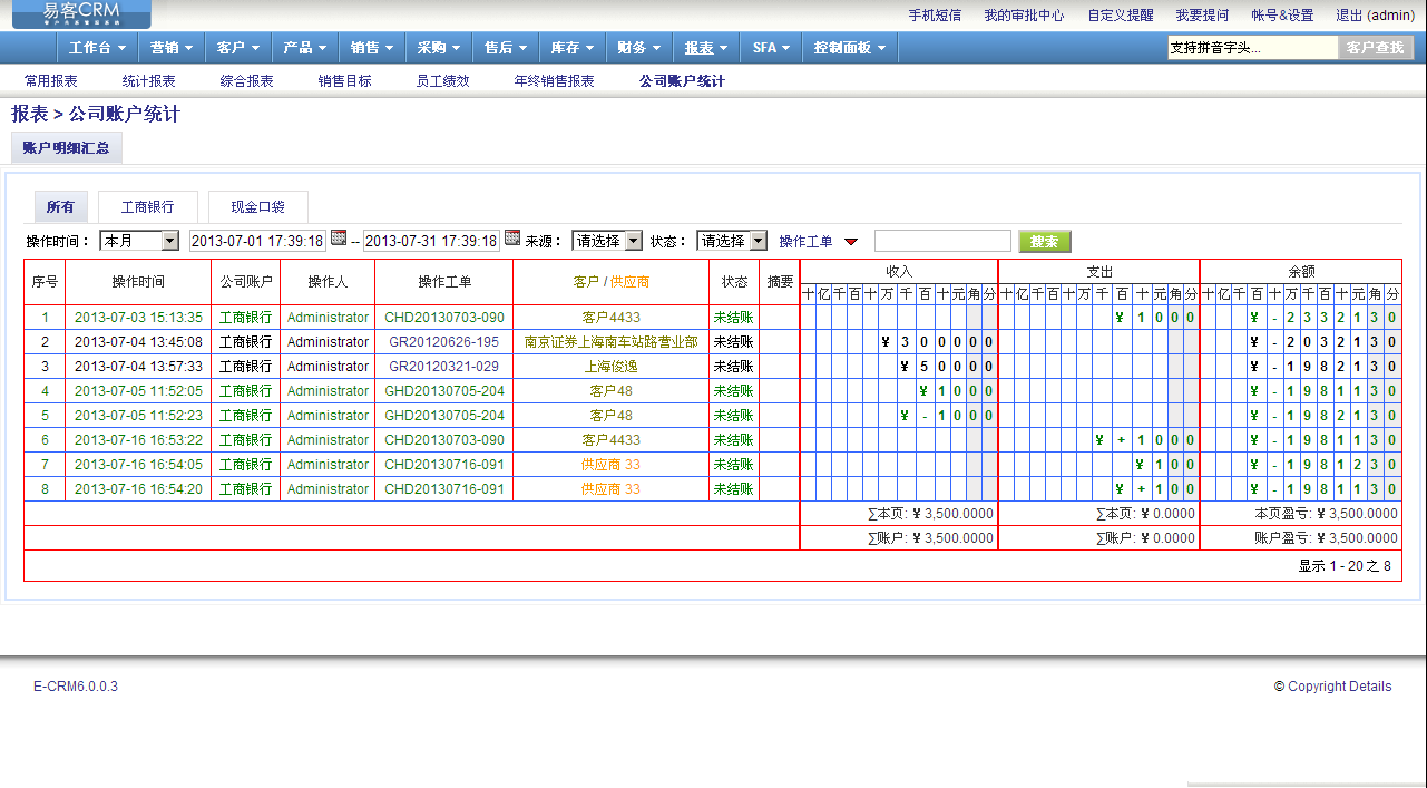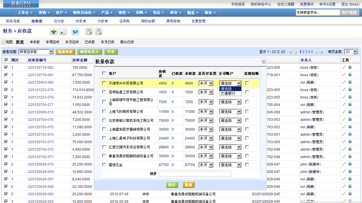 另外,易客CRM中增加批量收款、批量付款的功能,在收款和付款的时候需要选择账户,根据账号的收支情况可以生成公司账户统计报表,也可以设置每个公司账户的查看权限,一般来说财务和老板拥有公司账户的权限即可。